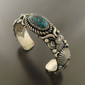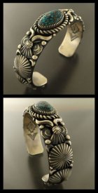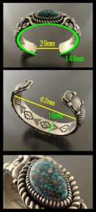 とっても深い青緑色のターコイズで、スパイダーウェッブ(蜘蛛の巣模様)も美しいチャイニーズターコイズを贅沢にあしらったバングルです。